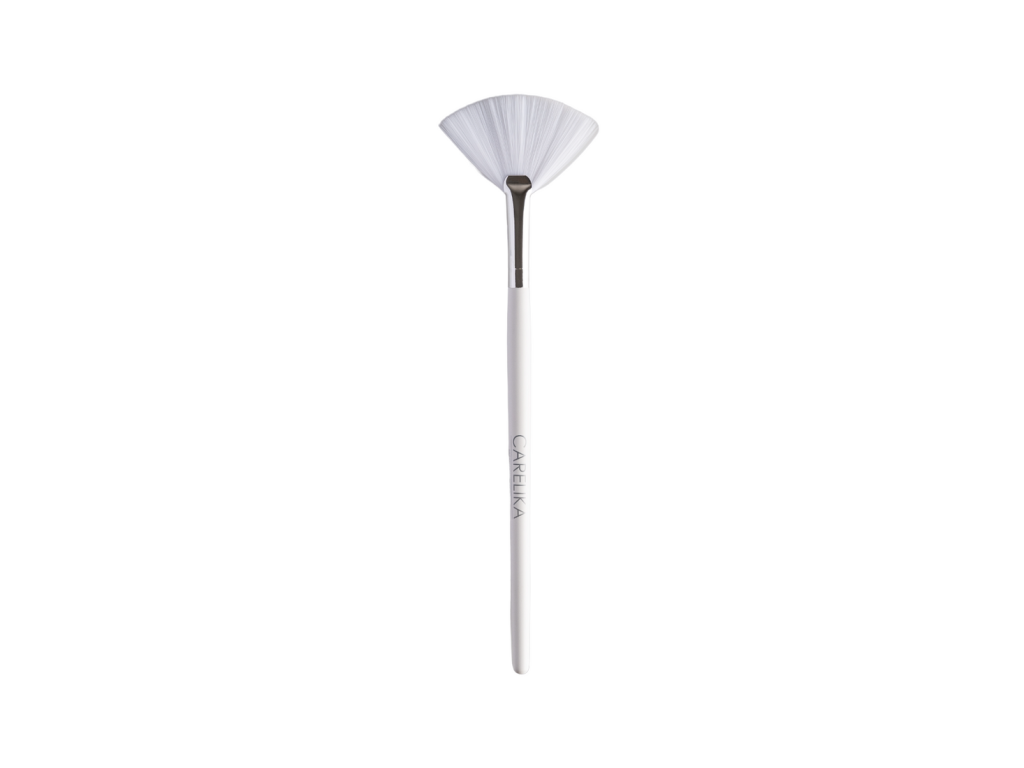 Štetec ve tvaru vějíře pro nanášení kosmetických produktů s logem Carelika.